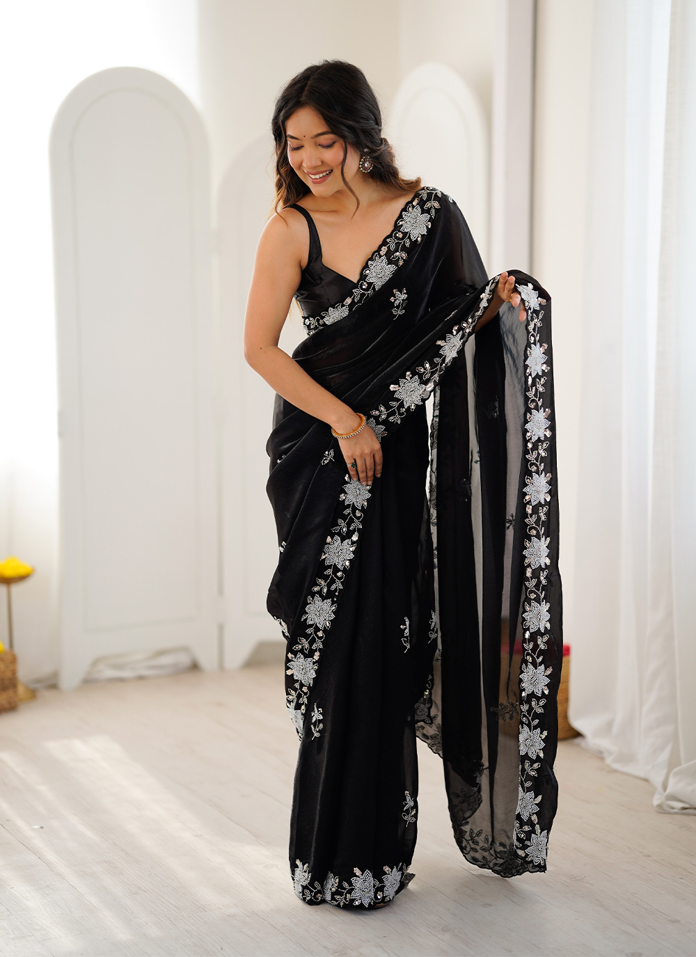 Looking These Fancy Party Wear Saree in Fine Colored.These Saree Are Fendy Satin And Blouse is Fendy Satin Fabricated.Its Beautified With Designer Sequance,Moti And Cut Dana Work.