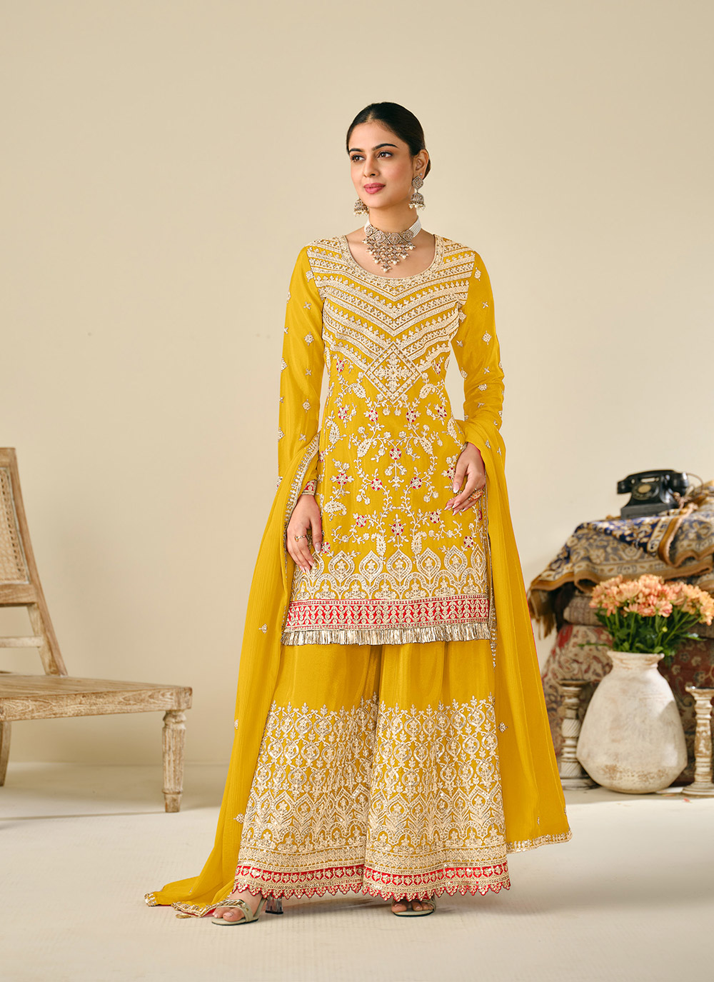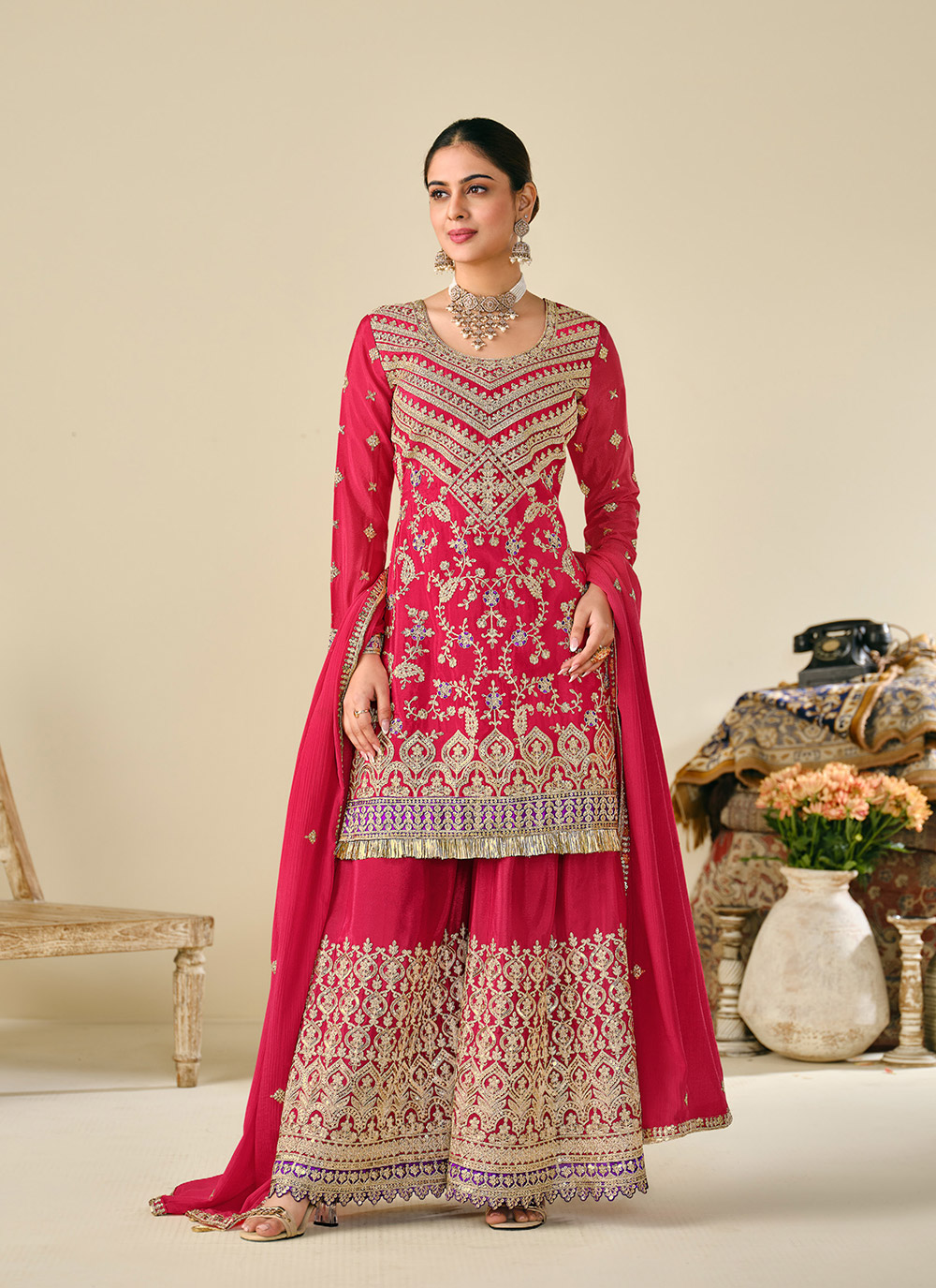 Attrective Looking These Plazzo Suit in Fine Colored Pair With Bottom And Dupatta.These Top And Dupatta Are Fabricated On Chinon Pair With Chinon Bottom.Its Beautified With Designer Multy Thread,Jari Embroidery Work.