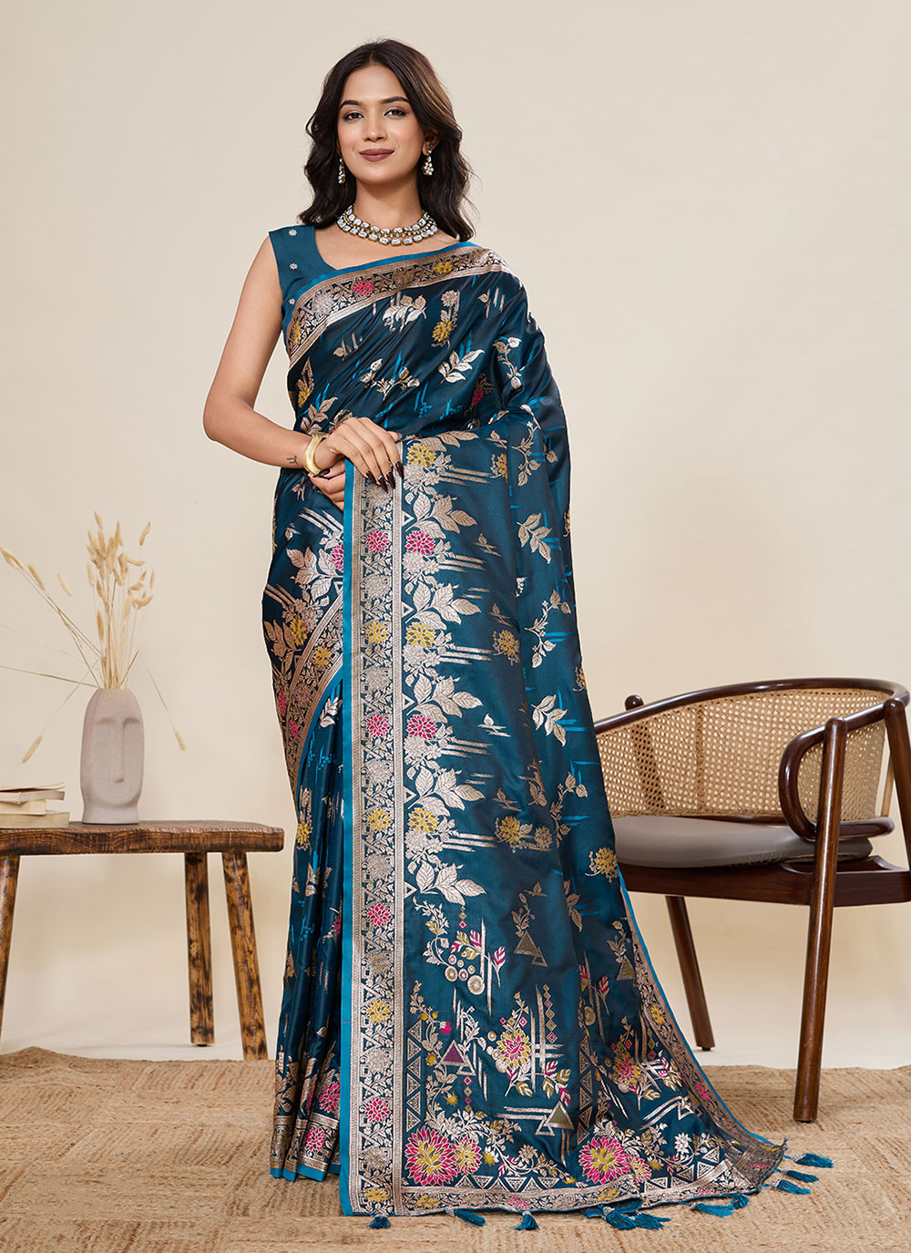 Looking This Party Wear Saree Paired With Blouse.This Saree And Blouse Are Two Tone Satin Silk Fabric With Woven Jari With Meenakari Designer. Buy This Pretty Saree Now.