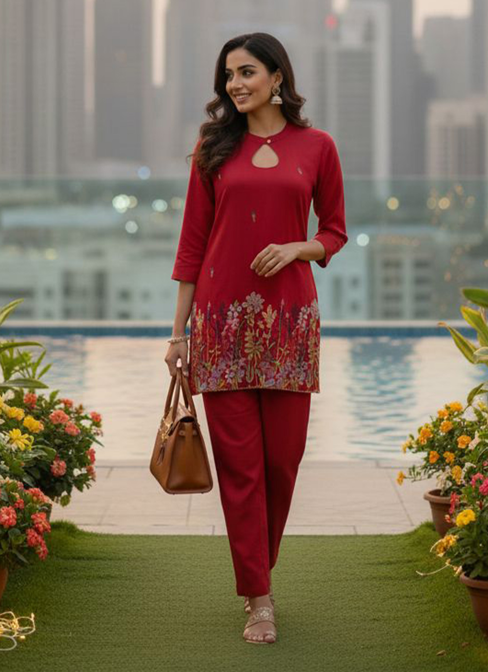Attactive These Designer Co Ord Ready Made Dress in Fine Colored.These Top Are Ribbed And Bottom Are Fabricated On Ribbed Pair.Its Beautified With Woven Designer.